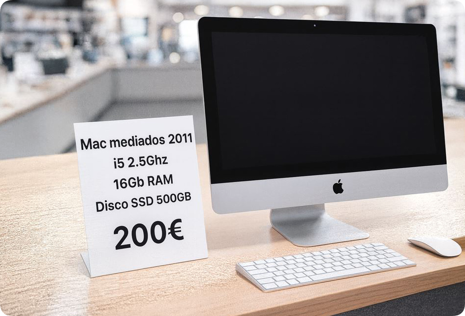 IMac, mediados del año 2011, con un procesaodr de cuatro nucleos i5 a 2.5 GHz, con 16 gb de RAM y un disco SSD de 500 gb . Instalado sistema MacOS Mojave de sistema operativo,. Se puede actualizar a la última version de sistema MacOS. Incluido teclado y ratón inalambrico compatibles con sistema Mac.