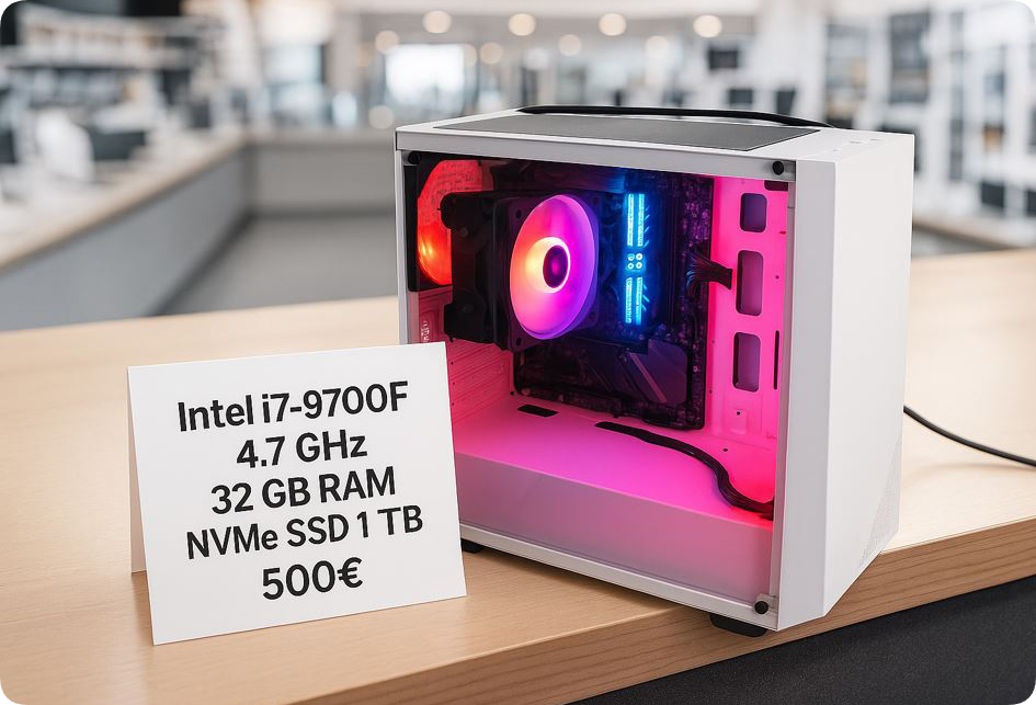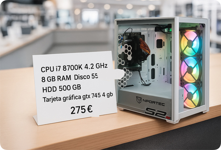 CPU I7 8700k, con procesador de 8 nucleos a 4.2 GHz , 8 GB RAM, con un disco de almacenamiento 256 GB SSD y otro HD de 500 GB, con una tarjeta gráfica GTX 745 de 4 GB. Ventiladores LED con mando a distancia. Caja Nforce con cristal templado.