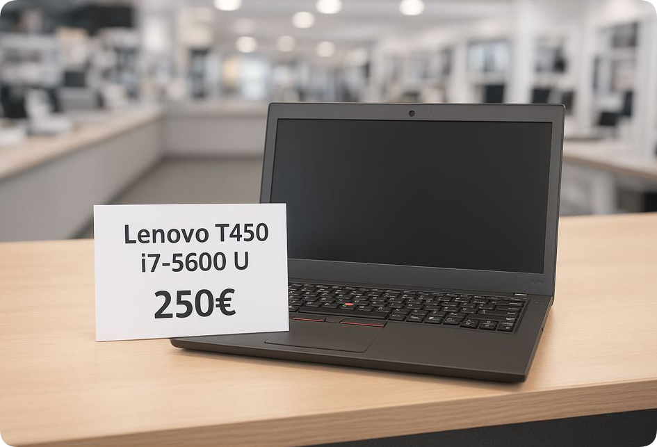 Portátil Lenovo ThinkPad T450 en perfecto estado. Es un equipo ligero y elegante, ideal para trabajar o estudiar. - Procesador Intel Core i7-5600U. - Pantalla de 14 " - Ranura 4g y lector DNI - 16 GB de RAM. - Disco SSD de 960 Gb - Webcam - Tarjeta de Red, WiFi y Bluetooth - Cargador nuevo Con Windows 10 instalado además de office 2019 y, winrar, pdf, etc..