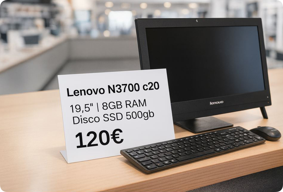Equipo Lenovo N3700 todo en uno en perfecto estado. - Pantalla de 19,5 " - 8Gb RAM - Disco SSD 500 gb - USB 3.0 - Cable de red y WiFi - Bluetooth - Webcam con Windows 10, Office 2021 , y los programas principales - Incluye teclado y ratón. - Pantalla nítida. - Diseño elegante y compacto.